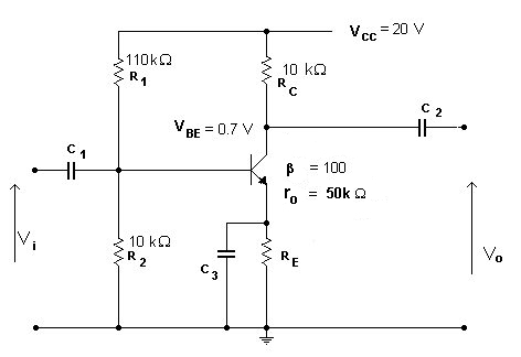 1. Perform an analysis of the circuit below (draw the equivanent circuit for frequencies where the capacitors can be ignored and calculate the input and output impedances and the voltage gain) and then find a value for the emitter resistor to make the DC collector current 1.2mA