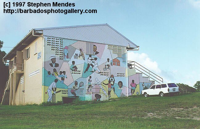 [59K]This mural on the side of the pavilion... at the playing field in Passage Road... depicts various sports and aspects of