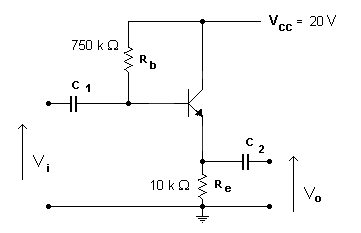 1. Perform an analysis of the circuit below (draw the equivanent circuit for frequencies where the capacitors can be ignored and calculate the input and output impedances and the voltage gain) and then find a value for the emitter resistor to make the DC collector current 1.2mA