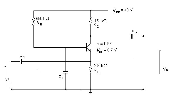 The circuit below shows a common base BJT amplifier, analyze the amplifier for Medium frequencies using the re model (simplified Ebers-Moll neglecting the insignificant effect of ro)