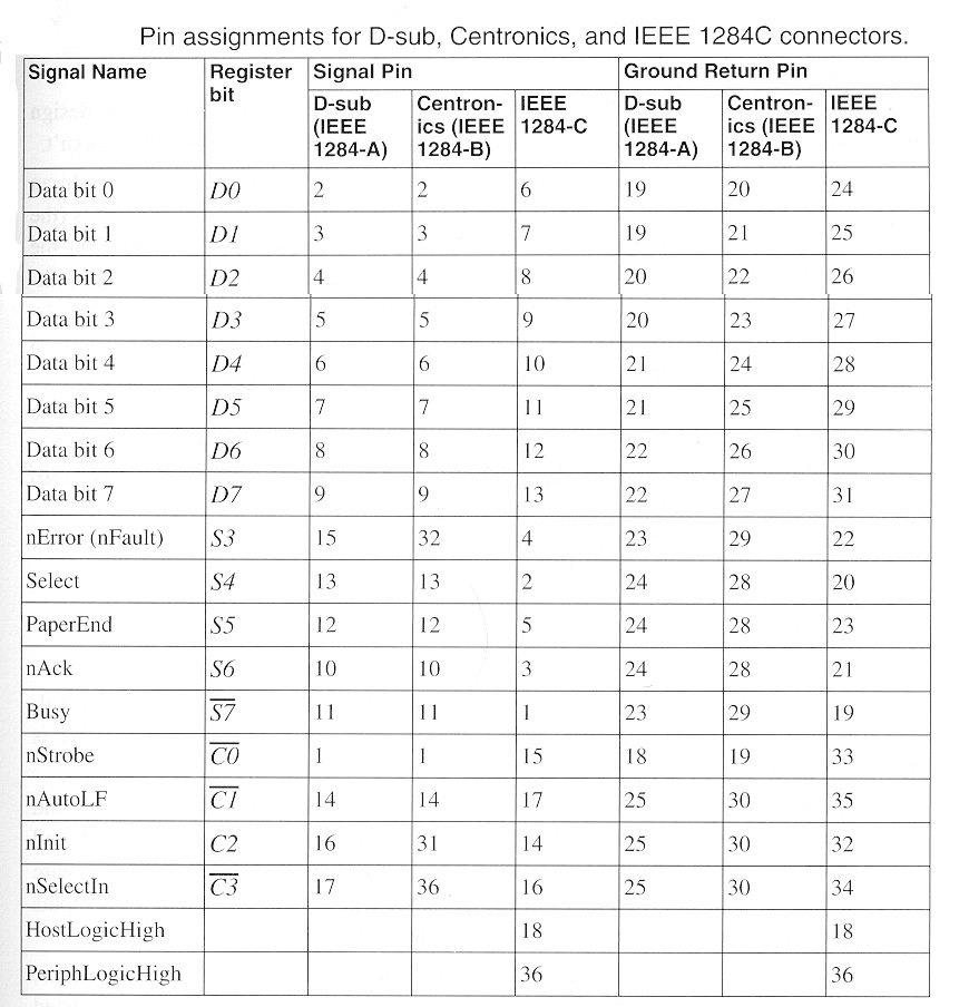 the signals, arranged by pin number
